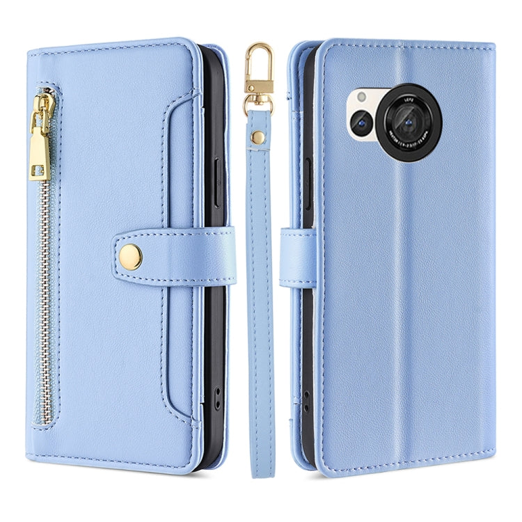 Funda de Cuero para Sharp Aquos R8 Sh-52D Lite con Textura Sheep, Cross-Body y Zipper (Azul)