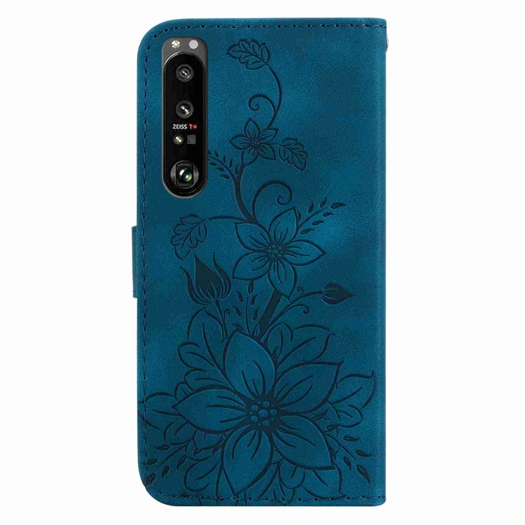 Funda de Cuero para Sony Xperia 1 III Lily en Relieve (Azul Oscuro)