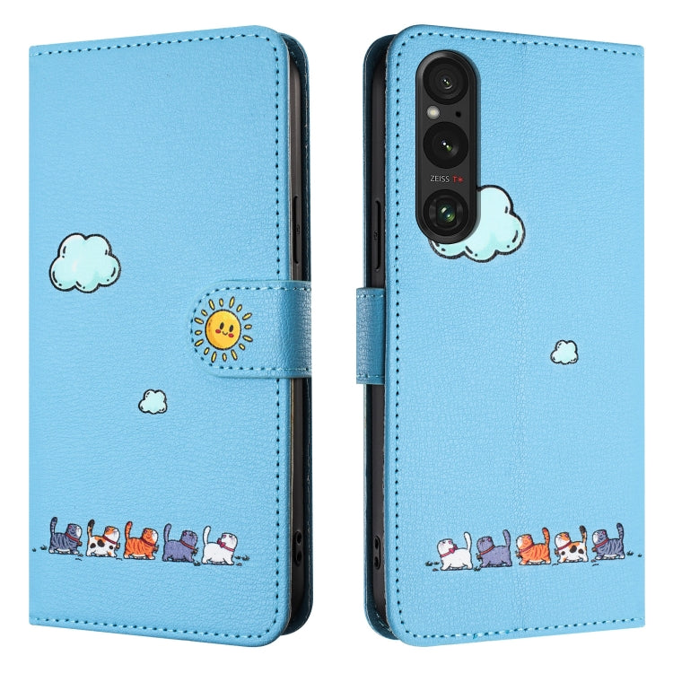Funda de Cuero para Sony Xperia 1 V con Gatos de Dibujos Animados (Azul)