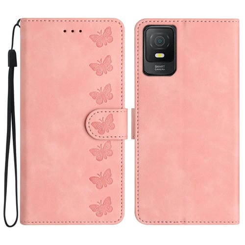 Funda de Cuero para TCL 40 Se Seven Butterflies con Relieve (Rosa)