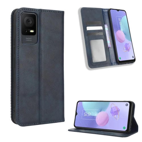 Funda de Cuero para TCL 408 con Hebilla Magnética y Textura Retro (Azul)