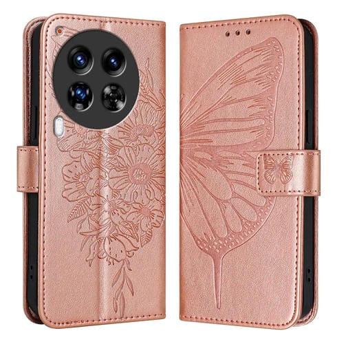 Funda de Cuero para Tecno Camon 30 Premier 5G con Mariposa en Relieve (Oro Rosa)