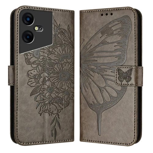 Funda de Cuero para Tecno Pova Neo 3 con Mariposa en Relieve (Gris)