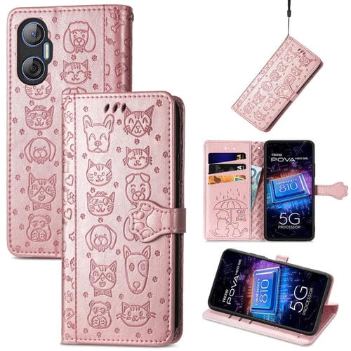 Funda de Cuero para Tecno Pova Neo 5G Cat And Dog en Relieve (Oro Rosa)