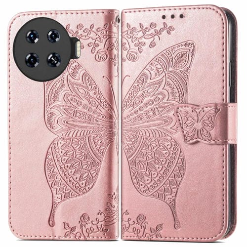 Funda de Cuero para Tecno Spark 20 Pro con Relieve de Flor y Mariposa (Oro Rosa)