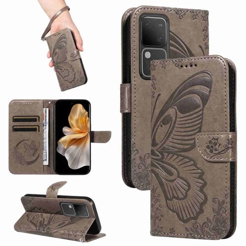 Para Vivo S18 5G Swallowtail Butterfly Funda de Cuero para Teléfono En Relieve (Gris)