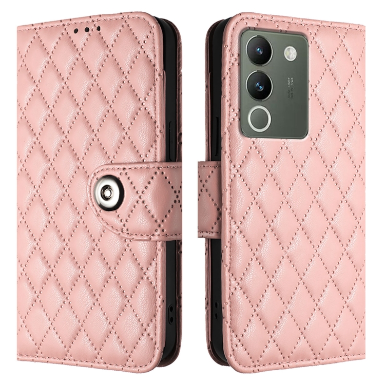 Para Vivo V29E / Y200 / V30 Lite Funda para Teléfono con Tapa de Cuero con Textura Rómbica y Cordón (Rosa Coral)