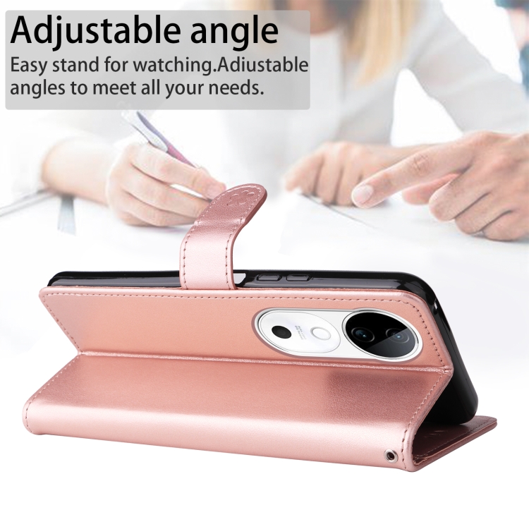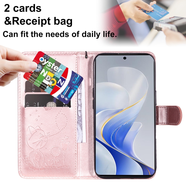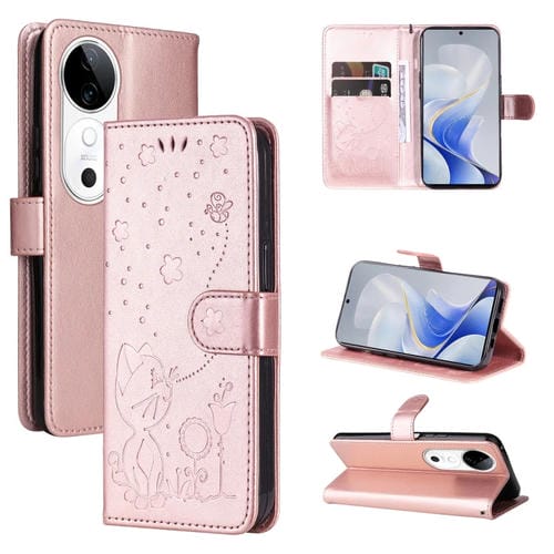 Para Vivo V40 5G Funda para Teléfono de Cuero con Tapa En Relieve con Diseño de Gato y Abeja (Oro Rosa)
