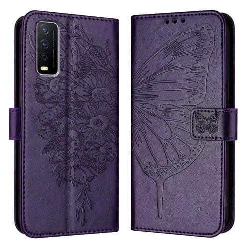 Para Vivo Y30 4G Funda para Teléfono de Cuero con Mariposa En Relieve Global (Púrpura Oscuro)