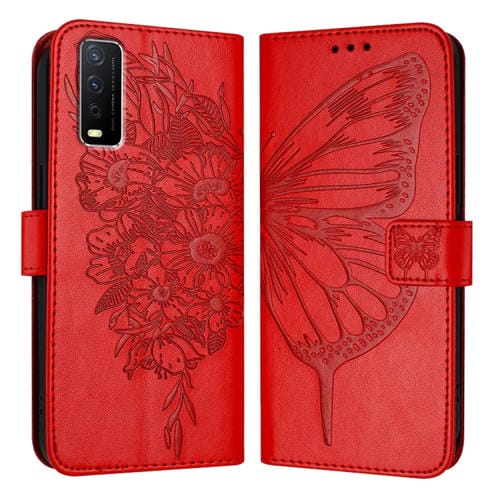 Para Vivo Y30 4G Funda para Teléfono de Cuero con Mariposa En Relieve Global (Rojo)