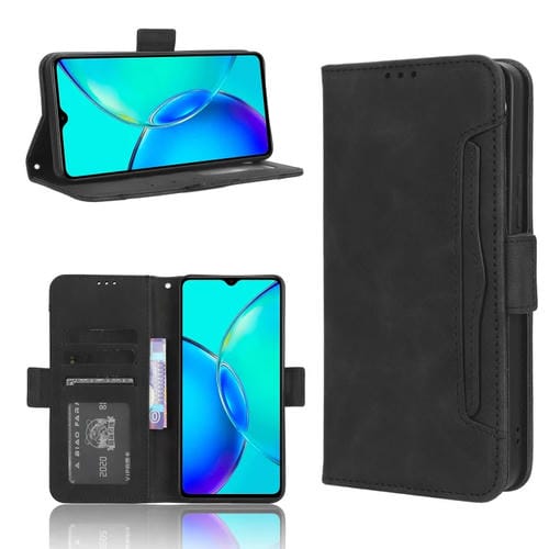 Para Vivo Y35 + 5G Skin Feel Becerro Textura Ranuras para Tarjetas Funda de Cuero para Teléfono (Negro)