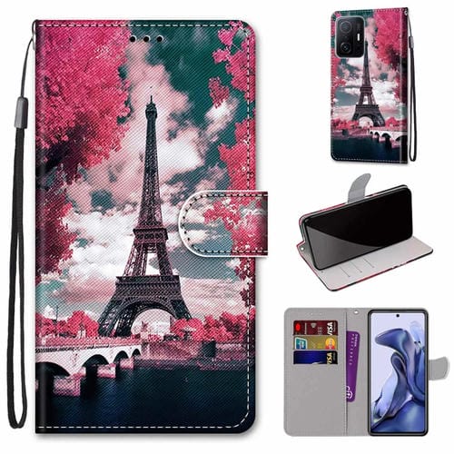 Para Xiaomi 11T / 11T Pro Coloree Dibujos de Cross Texture Horizontal Flip de Cuero Teléfono Teléfono con Titular y Tarjetas Slots & Wallet & Lanyard (Puente Pink Flower Tower)