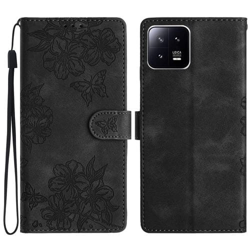 Para Xiaomi 13 Cherry Blossom Butterfly Skin Feel Funda para Teléfono de Pu En Relieve (Negro)