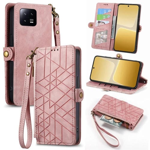 Para Xiaomi 13 Funda de Teléfono de Cuero con Hebilla Lateral de Billetera con Cremallera Geométrica (Rosa)
