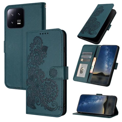 Para Xiaomi 13 Pro Datura Flower Funda de Teléfono de Cuero con Tapa En Relieve (Verde Oscuro)