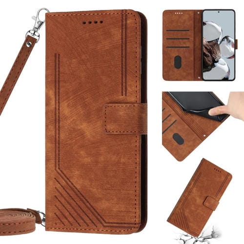 Para Xiaomi 13 Skin Feel Stripe Pattern Funda de Cuero para Teléfono con Cordón (Marrón)