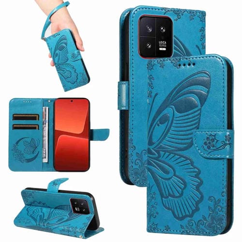 Para Xiaomi 13 Swallowtail Butterfly Funda de Teléfono de Cuero En Relieve (Azul)