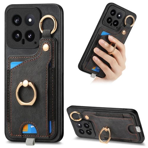 Para Xiaomi 14 Funda Para Teléfono Con Bolsa Para Tarjeta Con Anillo Y Sensación De Piel Retro Con Lazo Para Colgar (Negro)