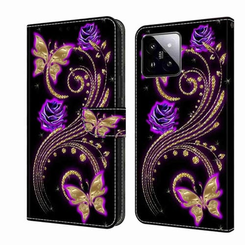 Para Xiaomi 14 Pro Crystal 3D Funda Protectora De Cuero Para Teléfono A Prueba De Golpes (Mariposa De Flor Púrpura)