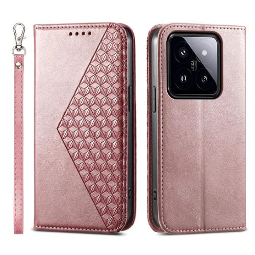 Para Xiaomi 14 Pro Cubic Grid Calf Texture Funda De Teléfono De Cuero Magnético (Oro Rosa)