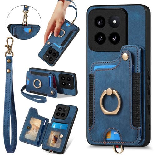 Para Xiaomi 14 Pro Retro Skin-Feel Ring Funda Para Teléfono Con Billetera Rfid Con Múltiples Tarjetas (Azul)