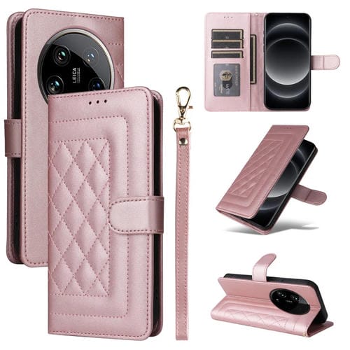 Para Xiaomi 14 Ultra Diamond Lattice Funda Para Teléfono Con Tapa De Cuero (Oro Rosa)