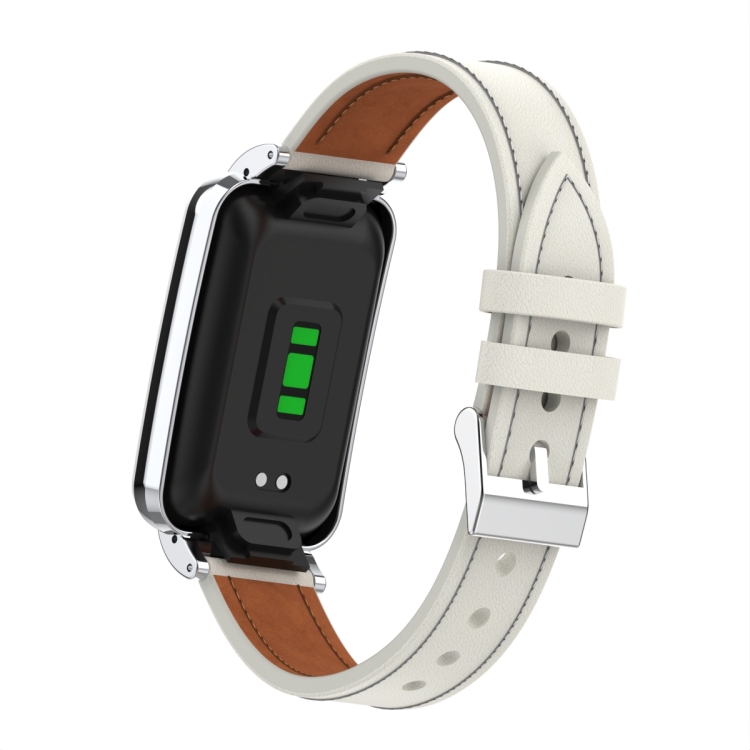 Correa para Xiaomi Mi Band 7 Pro con Marco de Metal y Cuero de Microfibra (Blanca Cálida y Plateada Brillante)