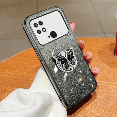 Para Xiaomi Poco C40 Funda para Teléfono de TPU con Soporte de Mariposa con Brillo Degradado Plateado (Negro)