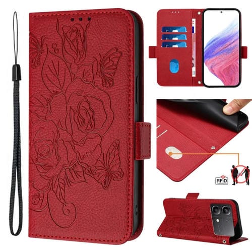 Para Xiaomi Poco X6 Neo 5G Funda para Teléfono de Cuero Antirrobo Rfid con Relieve Rosa (Rojo)