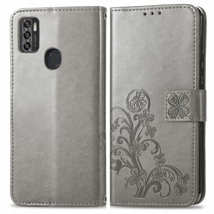 Para ZTE A7S 2020 Cierre de cuatro hojas con hebilla en relieve Protección de teléfono móvil Funda de cuero con cordón y tarjetas Slot & Wallet y función de soporte (gris)