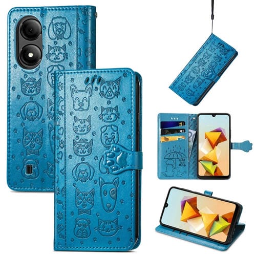 Funda para ZTE Blade A33S de Cuero con Relieve de Perro y Gato (Azul)
