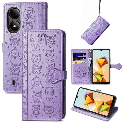 Funda para ZTE Blade A33S de Cuero con Relieve de Perro y Gato (Púrpura)