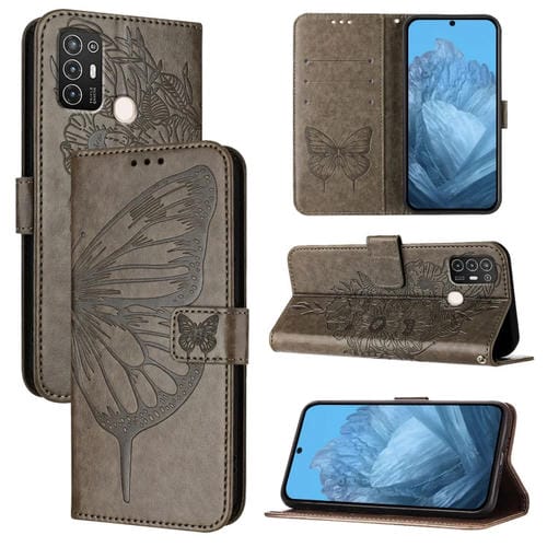 Funda de Cuero para ZTE Blade A52 con Mariposa en Relieve (Gris)