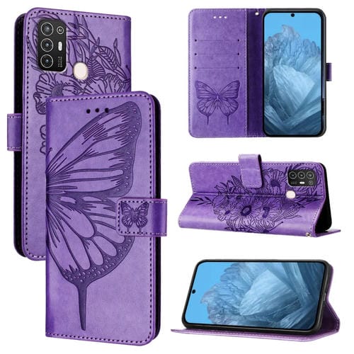 Funda de Cuero para ZTE Blade A52 con Mariposa en Relieve (Púrpura)