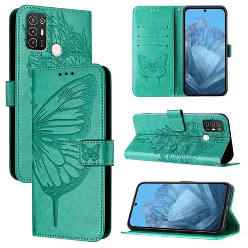 Funda de Cuero para ZTE Blade A52 con Mariposa en Relieve (Verde)