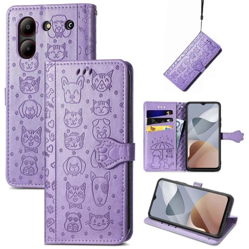 Funda para ZTE Blade A54 de Cuero con Relieve de Gato y Perro (Púrpura)