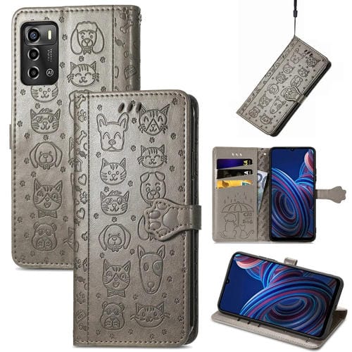 Estuche de Cuero en Relieve para ZTE Blade A72 4G con Diseño Cute CAT and Dog (Gris)