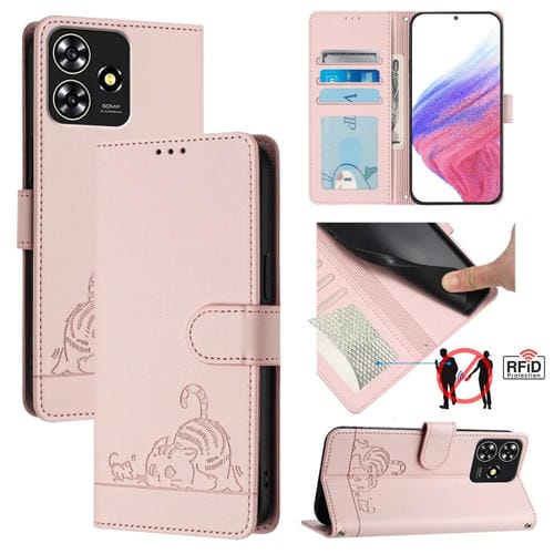 Estuche para ZTE Blade A73 4G CAT de Cuero RFID con Patrón en Relieve y Cordón (Rosa)