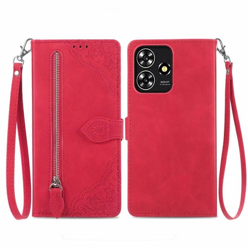 Funda de Cuero para ZTE Blade A73 4G con Cremallera y Flor en Relieve (Rojo)