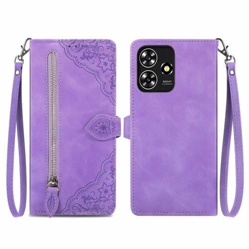 Funda de Cuero para ZTE Blade A73 4G con Cremallera y Flores en Relieve (Púrpura)