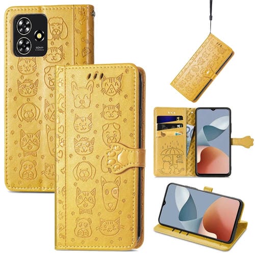 Funda para ZTE Blade A73 4G de Cuero con Relieve de Perro y Gato (Amarillo)