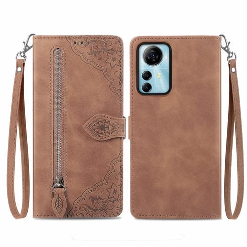 Funda de Cuero para ZTE Blade V41 con Cremallera y Flor en Relieve (Marrón)