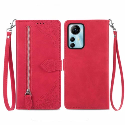 Funda de Cuero para ZTE Blade V41 con Cremallera y Flor en Relieve Inteligente (Rojo)