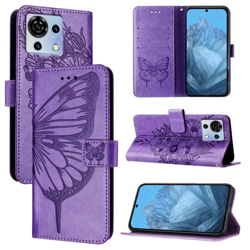 Funda de Cuero ZTE Blade V50 Vita con Mariposa en Relieve (Púrpura)