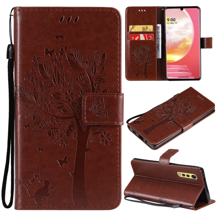 Funda de Cuero PU con Soporte y Tarjetero para LG Velvet 2 Pro (Brown) Patrón Árbol y Gato