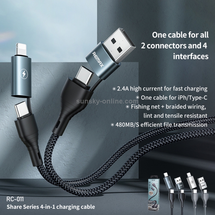 Cable Remax Rc-011 4-en-1 Usb A Usb-C Type-Cx2 + Cable 8 Pines (Plateado)