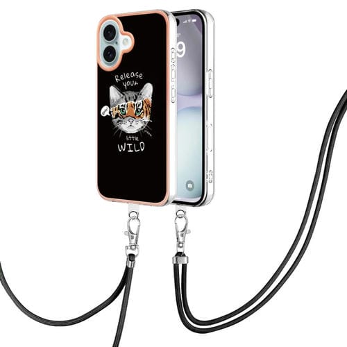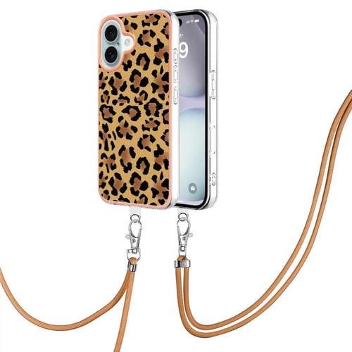 Estuche para teléfono Imd doble cara con galvanoplastia y cordón para iPhone 16 (Estampado de leopardo)