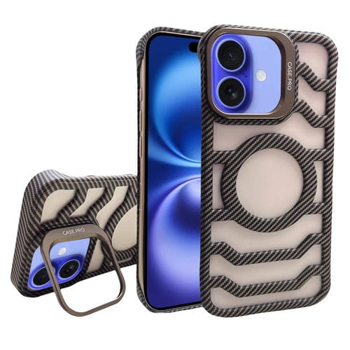 Estuche para Teléfono Magsafe con Soporte Protección de Lente Fibra de Carbono para iPhone 16 (Dorado)