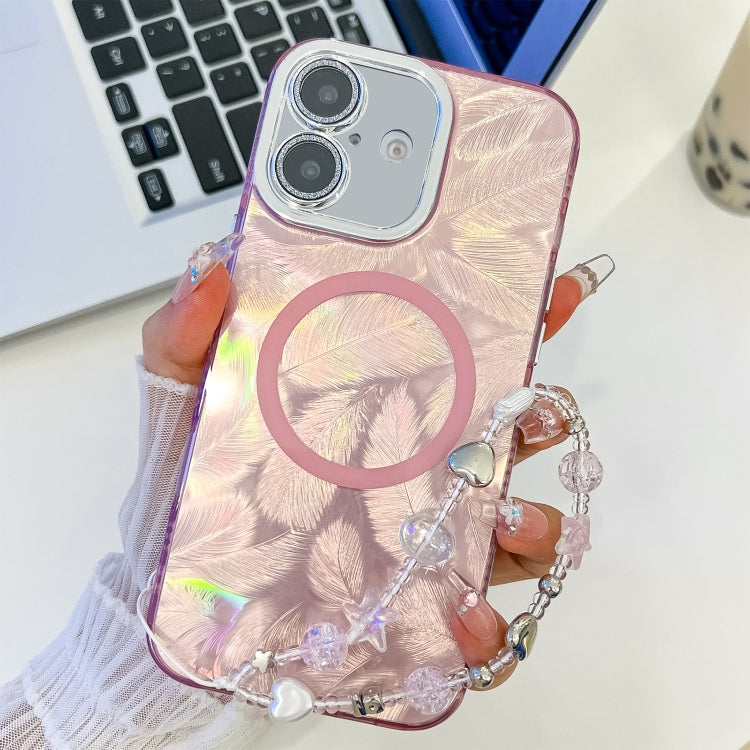 Funda para iPhone 16 Plus Textura Enchapada Pulsera Magsafe TPU Película Lente Purpurina (Plumas Rosas)