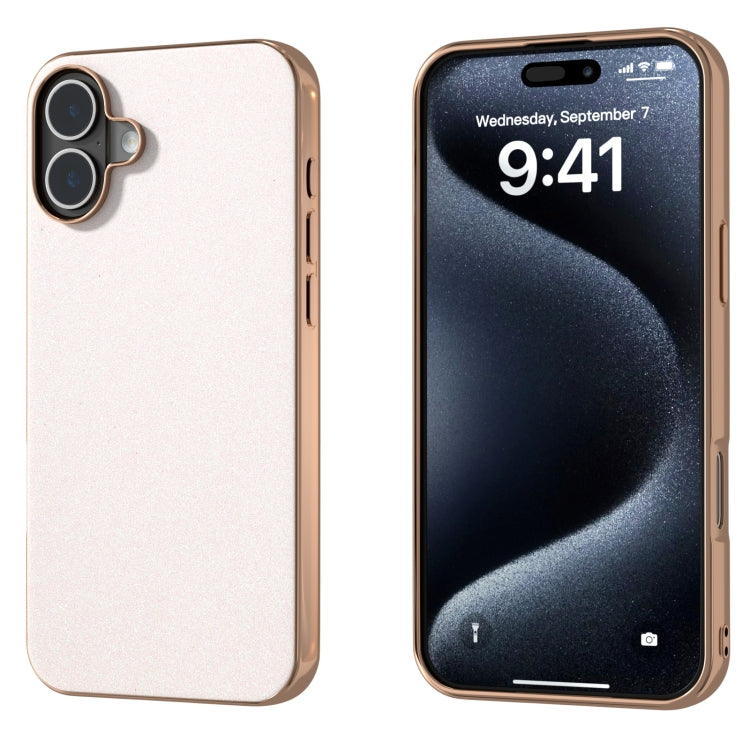 Funda de teléfono PU con textura Lichi dos colores y Nano Galvanoplastia para iPhone 16 Plus (Blanca)
